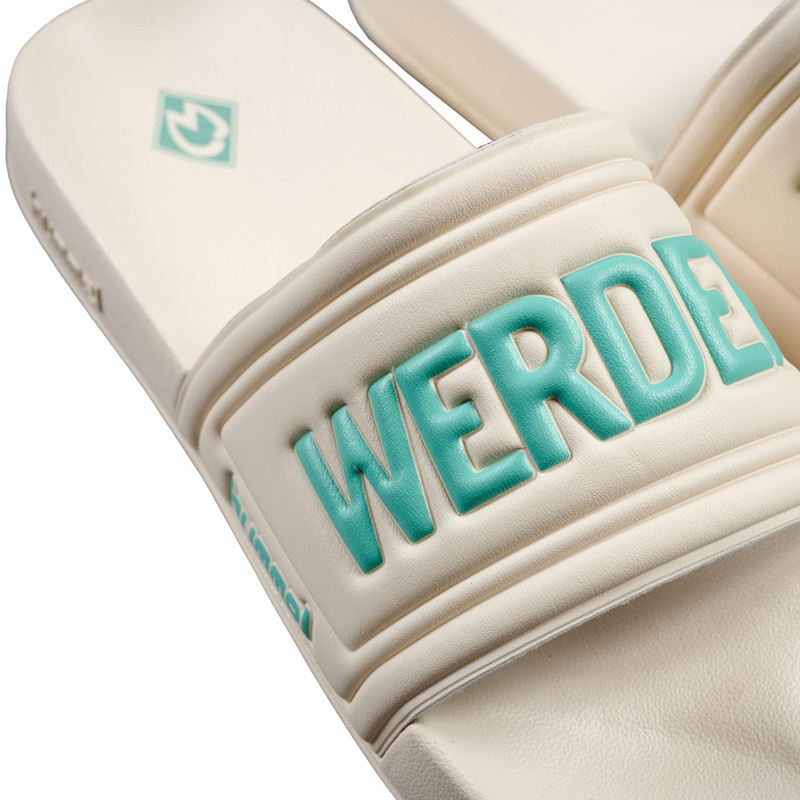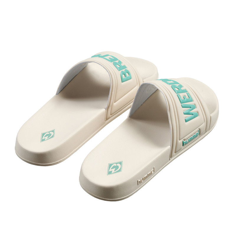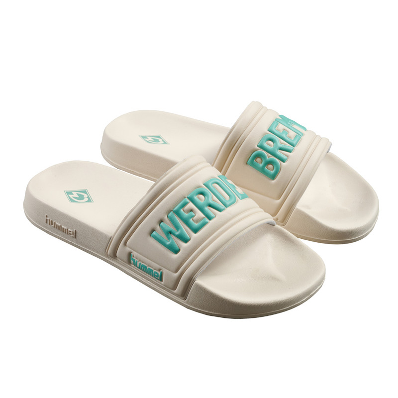 Produktdetails Für Werder Bremen, egal wo und wann. Die Badelatschen in Offwhite von unserem Ausrüster hummel im Werder Bremen Design begleiten dich überall hin.Das leichte Fußbett bietet eine bequeme Passform. Die breiten Riemen über den Fußrücken zeigen den „Werder Bremen“-Schriftzug in Mintgrün, wobei jeder Schuh nur durch eins der zwei Worte geziert wird. Zwei hummel-Prägungen befinden sich jeweils auf der Außenseite der Sohle. Das Design wird abgerundet durch die Werder-Raute als Druck auf der Innensohle. Damit werden diese Badeschuhe zu einem Fan-starken Detail für dein Outfit nach dem Training, im Schwimmbad, am Strand oder Zuhause.Mit diesen Badelatschen komplettierst du deinen Werder-Look! #abkuehlungBesonderheiten leichtes Fußbett breiter Riemen bequeme Passform links: Werder-Schriftzug rechts: Bremen-Schriftzug links und rechts Werder-Raute als Druck auf der Innensohle hummel-Prägung jeweils auf der Außenseite der Sohle Angaben zum Hersteller hummel Sport & Leisure Warenhandelsgesellschaft mbH Leverkusenstrasse 54 DE-22761 Hamburg info@hummelsport.de