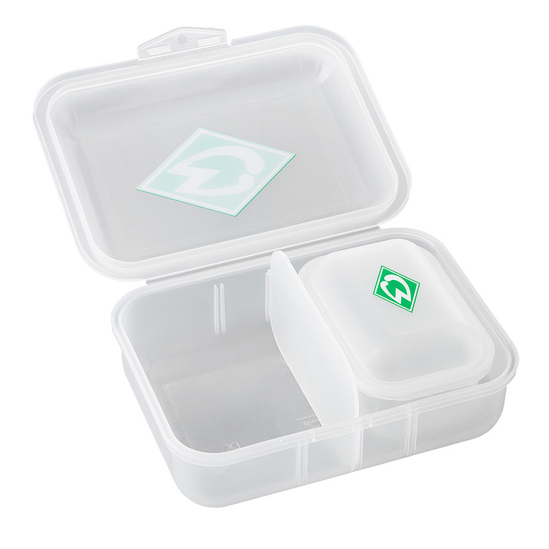 Produktdetails Perfekt für den großen und kleinen Hunger.Die praktische SVW Brotdosen kommt im 2er-Set mit einer großen und einer kleineren Dose. Sie bietet eine Vielzahl von Verwendungsmöglichkeiten, da sie über ein flexibel verstellbares Hauptfach verfügt. Dadurch lässt sich die Brotdose in zwei Fächer teilen, wodurch sich Lebensmittel auch getrennt voneinander aufbewahren lassen. Die kleinere Dose lässt sich zudem in der größeren Dose verstauen. Egal, ob einzeln oder ineinandergesteckt diese Brotdosen sind die idealen Transportbehälter für Brötchen, Brote, Obst oder andere Lebensmittel. Auf beiden Brotdosen ist natürlich auch die grüne Werder-Raute zu sehen, welche auf den transparenten Dosen direkt ins Auge fallen. Sie sorgen somit für vereinsverbundene Akzente und zeigt deinem Gegenüber direkt, für welchen Verein dein Herz schlägt.Sie punktet zudem durch ihren zuverlässigen Klickverschluss, durch dem sich beide beiden Dosen problemlos öffnen und wieder schließen lassen. Praktisch und SV Werder Bremen Fan-nah zugleich.So fällt es leicht, seine Liebe zum Verein zu zeigen. #picknick#schulstartBesonderheiten Werder-Raute auf den Deckeln flexibel verstellbares Hauptfach 2er-Set mit einer großen und einer kleineren Dose kleine Dose lässt sich in großer Dose verstauen Weichmacher- und BPA-frei Geschmacks- und Geruchsneutral spülmaschinengeeignet Angaben zum Hersteller Werder Bremen Merchandising GmbH Hoerneckestraße 11/13 DE-28217 Bremenfanshop@werder.de