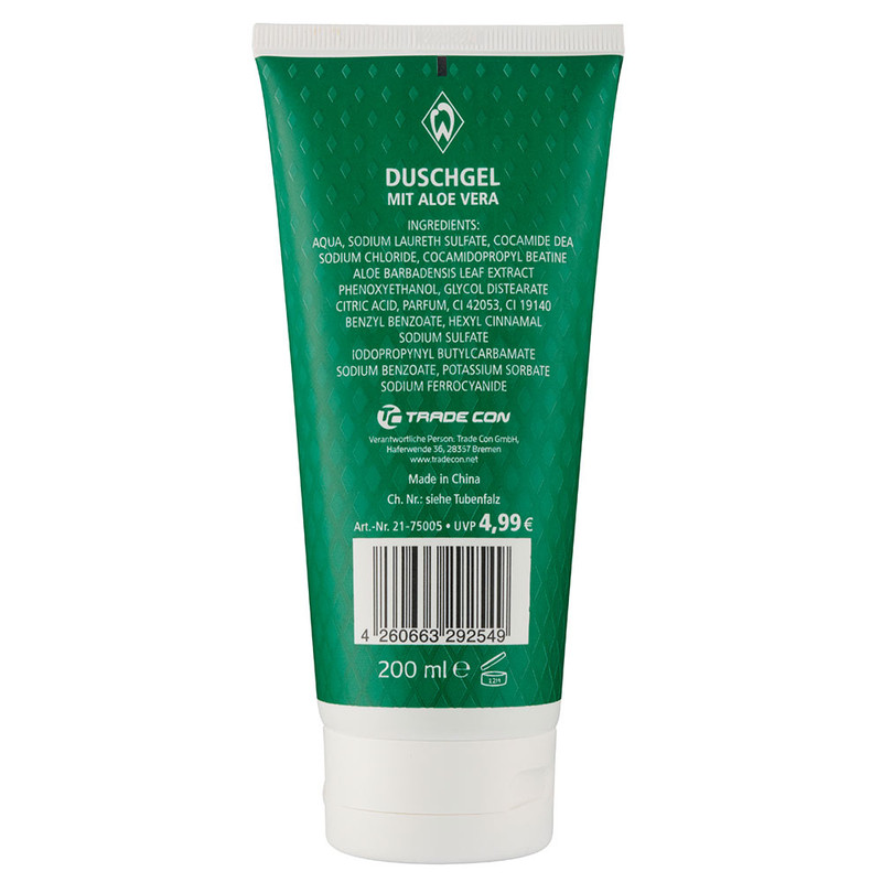 Produktdetails So macht das Duschen gleich viel mehr Spaß. Dank des neuen Werder Bremen Duschgels.Nach einem anstregnenden Tag oder einem ausgibigen Training gibt es doch nichts schöneres als eine entspannende Dusche. Das 2 in 1 Duschgel vom SV Werder Bremen ist Dank pflegender Aloe Vera die perfekte Pflege für dein Haut und deine Haare.Die Verpackung strahlt im coolen Werder-Grün. Als Eye-Catcher ist der Hintergrund des Designs mit vielen kleinen Rauten geschmückt, welche am unteren Ende zusammenlaufen und eine „Tor-Netz“-Optik entstehen lassen. Mittig ist groß die Werder-Raute aufgedruckt, um schon morgens nach dem Aufstehen Vorfreude auf das nächste Spiel zu bekommen.Ob morgens vor der Arbeit, nach dem Training oder vor dem nächsten Besuch im WESERSTADION: Dieses Duschgel hält dich immer frisch und versprüht dabei noch ein wenig Freude und Vereinsliebe. Es ist einfach ein absolutes Must-have in deiner Sporttasche. Besonderheiten Rauten-DesignWerder-Raute auf der Vorderseitemit Aloe Vera2 in 1 Für Körper und Haare