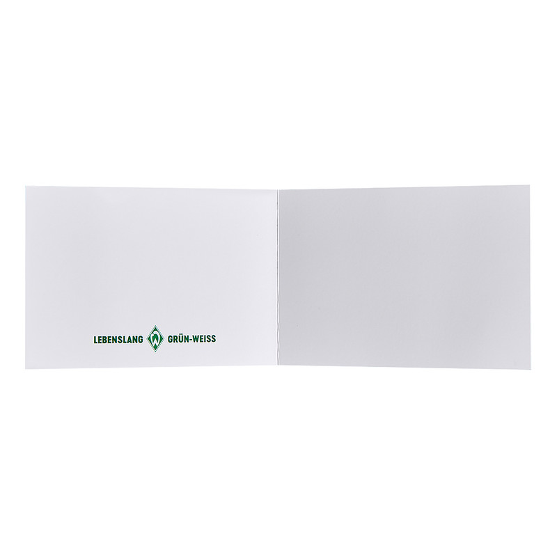 Produktdetails Zeit zu Feiern! Schöne SV Werder Bremen Glückwunschkarte im Querformat.Die Vorderseite der Klappkarte ist in Werder-Grün und geziert durch den dunkelgrünen Schriftzug „Herzlichen Glückwunsch“. Dabei ist das Wort „Herzlichen“ extra großgeschrieben, um die Herzlichkeit und die freundliche Art der Werderaner hervor zu heben. Die Werder-Raute setzt zudem noch weitere vereinsverbundene Akzente und lässt das Herz eines jeden Werder-Geburtstagskinds höherschlagen. Oder gibt es etwas anderes zu feiern? Kein Problem! Egal ob für einen erfolgreichen Abschluss, eine bestandene Prüfung, einen neuen Job oder einfach nur, weil mal wieder gefeiert werden muss. Diese Karte ist sehr vielseitig einsetzbar und wie geschaffen für jegliche Arten von Anlässen.Der Vereinsclaim „Lebenslang grün-weiß“ mit Werder-Raute auf der Karteninnenseite komplettiert das fußballstarke Design und lässt Raum für ein paar persönliche Worte. Der mitgelieferte selbstklebende Briefumschlag macht es zu einer runden Sache. Die Werder-Raute mit goldfarbenem Meisterstern in der linken oberen Umschlagecke ist das Fan-starke Detail. So wird jede Party fan-tastisch.Besonderheiten Klappkarte in Werder-Grün „herzlichen Glückwunsch“-Schriftzug in Dunkelgrün Werder-Raute Vereinsclaim „Lebenslang grün-weiß“ und Werder-Raute auf der Karteninnenseite inklusive selbstklebendem Briefumschlag Werder-Raute mit Meisterstern auf dem Umschlag Angaben zum Hersteller Crazy Three GmbH Mühlenweg 38 DE-28790 Schwanewede/Leuchtenburg info@crazythree.de