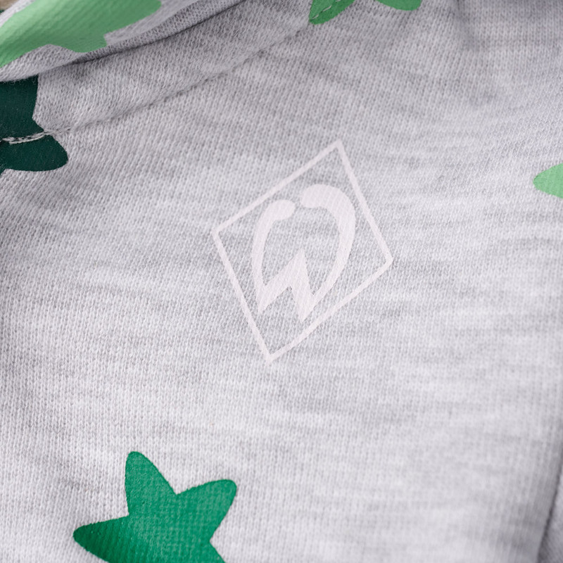 ProduktdetailsWerderliebe von Anfang an!Das fröhliche Allover-Muster aus Sternen und Werder-Rauten macht die Kapuzenjacke zu einem echten Hingucker für die ganz Kleinen. Die unterschiedlichen Grüntöne und Weiß auf grauem Grund sorgen für einen Look mit Vereinscharakter.Dank des durchgehenden Reißverschlusses lässt sich die Jacke kinderleicht an- und ausziehen – perfekt für unterwegs oder beim Einkuscheln zu Hause. Die Kapuze schützt das Köpfchen, während die weichen Bündchen für ein angenehmes Tragegefühl sorgen.Dieser Baby-Hoodie bringt nicht nur Wärme, sondern auch ganz viel Herz – und Sternenglanz! #fanliebeminiBesonderheitenHinweise zur Nachhaltigkeit Dieses Produkt trägt den Grünen Knopf. Das heißt: hohe soziale und ökologische Standards. Vom Staat festgelegt und von unabhängigen Prüfern kontrolliert. CHAPS Merchandising GmbH trägt die Produktverantwortung für diesen „Grüner Knopf”-zertifizierten Artikel.Dieser Artikel ist ebenfalls mit dem GOTS-Label ausgezeichnet, dem Global Organic Textile Standard, welches die Anforderungen an eine ökologisch- und sozialverträgliche Textilproduktion von biologisch erzeugten Rohstoffen unterliegt.Mehr Informationen zu diesen Themen findet ihr unter:Grüner Knopf: https://www.gruener-knopf.de/GOTS: https://global-standard.org/the-standard Grau meliert mit Allover-Muster aus Sternen und Werder-RautenFarben in verschiedenen Grün- und Weißtönenmit Reißverschluss und bequemer Kapuzeweiche Rippbündchen an Ärmeln und Saum Angaben zum HerstellerWerder Bremen Merchandising GmbH Hoerneckestraße 11/13 DE-28217 Bremenfanshop@werder.de