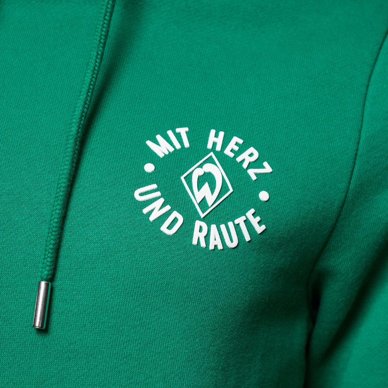 ProduktdetailsDieser Hoodie ist wie gemacht für alle Werder-Fans, die ihr Herz am richtigen Fleck tragen!Der runde Print „Mit Herz und Raute“ inklusive unserer Werder-Raute findet sich auf der (Herz-)seite. In kräftigem Grün gehalten, überzeugt der Hoodie durch schlichte Optik mit grün-weißer Botschaft.Die Kängurutasche, die gemütliche Kapuze mit Kordelzug und das weiche Material aus 100% Baumwolle aus biologischem Anbau machen diesen Hoodie zum perfekten Begleiter – ob für Spieltage im Stadion, entspannte Nachmittage auf dem Sofa oder unterwegs in der Stadt.Für alle, die Werder nicht nur tragen – sondern fühlen! Mit Herz und Raute! #neuehoodies BesonderheitenHinweise zur NachhaltigkeitDieses Produkt trägt den Grünen Knopf. Das heißt: hohe soziale und ökologische Standards. Vom Staat festgelegt und von unabhängigen Prüfern kontrolliert. CHAPS Merchandising GmbH trägt die Produktverantwortung für diesen „Grüner Knopf”-zertifizierten Artikel.Dieser Artikel ist ebenfalls mit dem GOTS-Label ausgezeichnet, dem Global Organic Textile Standard, welches die Anforderungen an eine ökologisch- und sozialverträgliche Textilproduktion von biologisch erzeugten Rohstoffen unterliegt.Mehr Informationen zu diesen Themen findet ihr unter:Grüner Knopf: https://www.gruener-knopf.de/GOTS: https://global-standard.org/the-standard grüner Hoodie mit Rundprint „Mit Herz und Raute“ auf der (Herz-)seitemit Werder-Raute im Print integriertKapuze mit KordelKängurutascheRippbündchen an Ärmeln und Saum Angaben zum HerstellerWerder Bremen Merchandising GmbH Hoerneckestraße 11/13 DE-28217 Bremenfanshop@werder.de