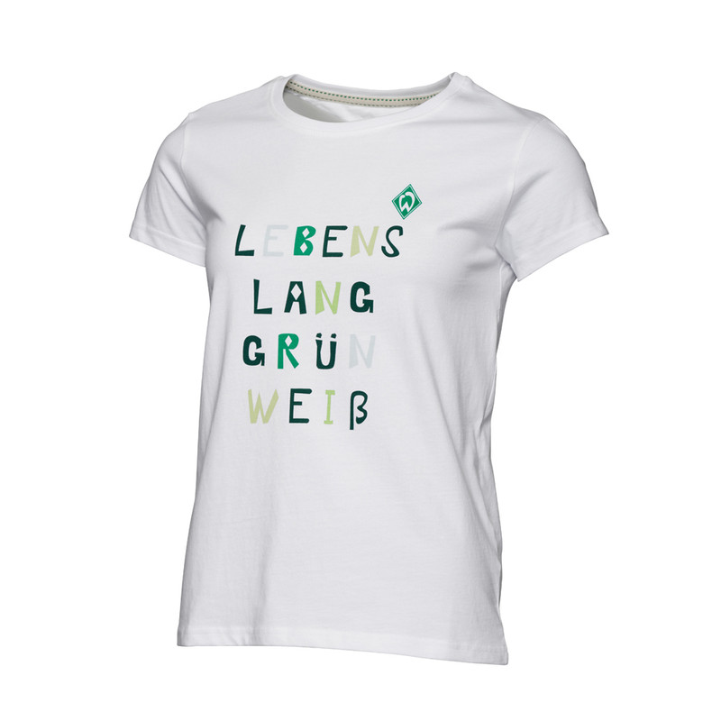 ProduktdetailsLebenslang grün-weiß! Dieses T-Shirt sagt alles – und das auf besonders kreative Weise!Der mehrfarbige Typo-Print „Lebenslang grün-weiß“ auf der Vorderseite setzt nicht nur ein starkes Fan-Statement, sondern bringt durch die verspielte Buchstabengestaltung und den Mix aus unterschiedlichen Grüntönen auch ein frisches Design mit.Das weiße T-Shirt überzeugt mit einem angenehm femininen Schnitt, einem klassischen Rundhalsausschnitt und der unverzichtbaren Werder-Raute auf der (Herz-)seite.Ob für den Stadionbesuch, den Stadtbummel oder den Alltag – mit diesem Shirt bist du immer grün-weiß unterwegs!#T-ShirtsFrauenBesonderheitenHinweise zur NachhaltigkeitDieses Produkt trägt den Grünen Knopf. Das heißt: hohe soziale und ökologische Standards. Vom Staat festgelegt und von unabhängigen Prüfern kontrolliert. CHAPS Merchandising GmbH trägt die Produktverantwortung für diesen „Grüner Knopf”-zertifizierten Artikel.Dieser Artikel ist ebenfalls mit dem GOTS-Label ausgezeichnet, dem Global Organic Textile Standard, welches die Anforderungen an eine ökologisch- und sozialverträgliche Textilproduktion von biologisch erzeugten Rohstoffen unterliegt.Mehr Informationen zu diesen Themen findet ihr unter:Grüner Knopf: https://www.gruener-knopf.de/GOTS: https://global-standard.org/the-standard kreativer Frontprint „Lebenslang grün-weiß“ in verschiedenen Grüntönenmit Werder-Raute auf der (Herz-)seiteRundhalsausschnitt Angaben zum HerstellerWerder Bremen Merchandising GmbH Hoerneckestraße 11/13 DE-28217 Bremenfanshop@werder.de