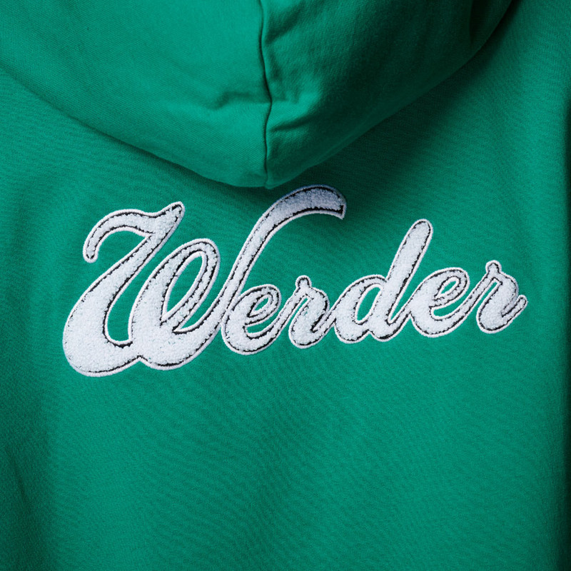 ProduktdetailsDieser Zip-Hoodie bringt alles mit, was dein Werder-Herz begehrt: einen modernen Look, bequemen Tragekomfort und ein aussagekräftiges Detail auf dem Rücken.Die Kapuzenjacke in frischem Werder-Grün punktet mit einem sportlich-schlichten Design und klassischen Akzenten wie den Streifen entlang der Ärmel, die den Retro-Vibe perfekt machen.Vorn zeigt sich die Sweatjacke bewusst reduziert, mit weißen Kordeln und Reißverschluss – doch das Highlight wartet hinten: Der große „Werder“-Schriftzug in geschwungener Vintage-Optik auf der Rückseite unterhalb der Kapuze ist ein echter Hingucker und macht den Zip-Hoodie zum stilvollen Bekenntnis zu deinem Verein.Ideal für Alltag, Stadion oder entspannte Wochenenden – diese Sweatjacke passt einfach immer. #neuehoodiesDieser Artikel gehört zu der Initiative „Vom Feld in den Shop“, ein Projekt für nachhaltig produzierte Fanbekleidung: Hiermit werden Kleinbauern in Indien bei der Umstellung auf biologischen Baumwollanbau unterstützt und Kinder aus den angrenzenden Gemeinden des Baumwollanbaus durch Sporttraining gefördert.  #vomfeldindenfanshopBesonderheitenHinweise zur Nachhaltigkeit Ziele des Fairtrade Textilstandards sind die Umsetzung von existenzsichernden Löhnen, die Stärkung von Arbeitern und Arbeiterinnen und mehr Sicherheit am Arbeitsplatz. Die Lieferkette von diesem Brands Fashion-Produkt ist nach dem Textilstandard zertifiziert. Es wird kontinuierlich daran gearbeitet, existenzsichernde Löhne in der kompletten Lieferkette umzusetzen, besuche: www.brands-fashion.comDarüber hinaus ist die gesamte Baumwolle in diesem Produkt von Fairtrade-Produzenten angebaut, nach dem Fairtrade-Baumwollstandard zertifiziert und gehandelt.Mehr Infos unter fairtrade-deutschland.de/siegel mit dem Fairtrade-Code 34261005Dieses Produkt trägt den Grünen Knopf. Das heißt: hohe soziale und ökologische Standards. Vom Staat festgelegt und von unabhängigen Prüfern kontrolliert. Brands Fashion GmbH trägt die Produktverantwortung für diesen „Grüner Knopf”-zertifizierten Artikel.Dieser Artikel ist mit dem Global Organic Textile Standard in Conversion (kurz: GOTS IC) ausgezeichnet, welches eine umweltfreundliche und sozialverantwortliche Herstellung der Textilien garantiert. Dabei wird die Umstellung zum kontrollierten biologischen Anbau unterstützt und die mit GOTS IC gekennzeichneten Artikel enthalten einen Mindestanteil von 95% Baumwolle in Umstellung. Zudem schafft Tracycle Transparenz über Ursprung und Fertigung sowie der gesamten Lieferkette dieses Produktes.Mehr Informationen zu diesen Themen findet ihr unter:Fairtrade: https://www.fairtrade-deutschland.de/was-ist-fairtrade/fairtrade-siegelGrüner Knopf: https://www.gruener-knopf.de/GOTS IC: https://global-standard.org/de/neuigkeiten/organic-in-conversion-storyTracycle: https://www.tracycle.com/1109302 Retro-LookÄrmel mit sportlichen KontraststreifenKapuze mit weißen Kordelngeschwungener „Werder“-Schriftzug auf dem Rücken (plüschiger Chenille-Stick)ReißverschlussRippbündchen an Ärmeln und Saumüberschnittene Ärmelumspielender Schnitt Angaben zum HerstellerWerder Bremen Merchandising GmbH Hoerneckestraße 11/13 DE-28217 Bremenfanshop@werder.de