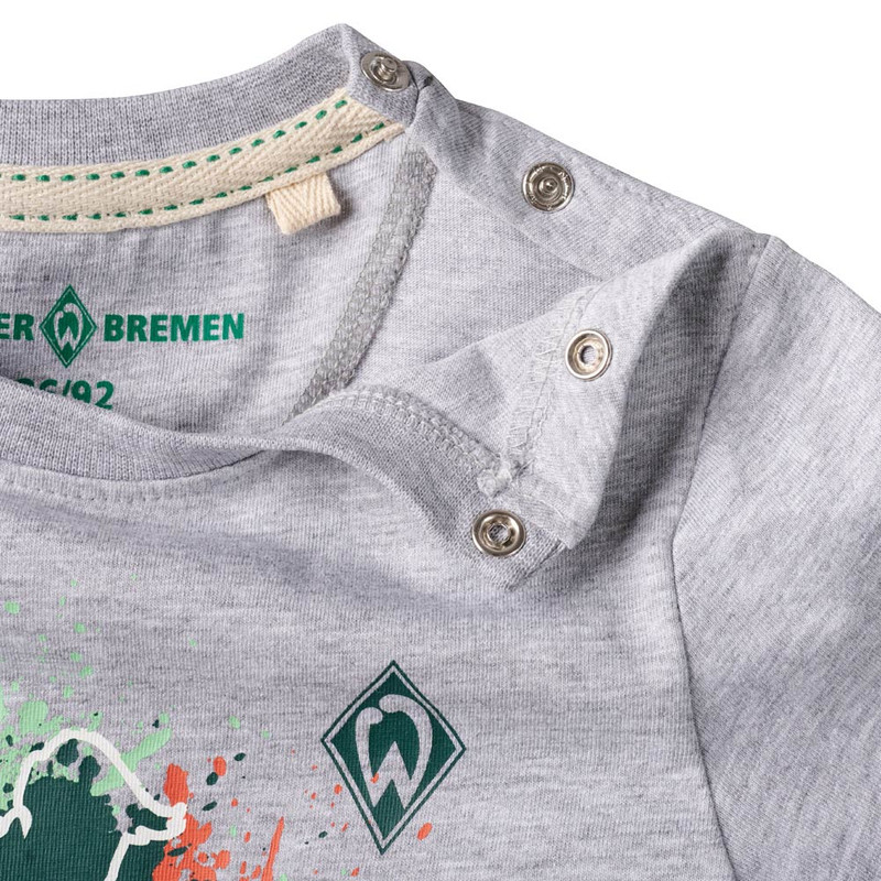 ProduktdetailsDieses Werder-T-Shirt für Kids bringt Bewegung in jeden Tag!Mit dem coolen Print in kräftigen Farben, dem angedeuteten Spieler-Silhouetten-Motiv und dem „WERDER“-Schriftzug auf der (Herz-)seite wird das Shirt zum Lieblingsstück für aktive Nachwuchsfans.Das grau melierte Shirt besteht aus 100% Baumwolle aus biologischem Anbau und überzeugt durch angenehmen Tragekomfort.Ob auf dem Bolzplatz oder im Kindergarten – dieses Teil strahlt echte Werder-Energie aus! #neukidsBesonderheitenHinweise zur NachhaltigkeitDieses Produkt trägt den Grünen Knopf. Das heißt: hohe soziale und ökologische Standards. Vom Staat festgelegt und von unabhängigen Prüfern kontrolliert. CHAPS Merchandising GmbH trägt die Produktverantwortung für diesen „Grüner Knopf”-zertifizierten Artikel.Dieser Artikel ist ebenfalls mit dem GOTS-Label ausgezeichnet, dem Global Organic Textile Standard, welches die Anforderungen an eine ökologisch- und sozialverträgliche Textilproduktion von biologisch erzeugten Rohstoffen unterliegt.Mehr Informationen zu diesen Themen findet ihr unter:Grüner Knopf: https://www.gruener-knopf.de/GOTS: https://global-standard.org/the-standard grau meliert mit farbigem Splash-Print & Spieler-Silhouette„WERDER“-Schriftzug auf der (Herz-)seiteDruckknöpfe an der Schulter (bis einschließlich Größe 98/104)Rundhalsausschnitt Angaben zum HerstellerWerder Bremen Merchandising GmbH Hoerneckestraße 11/13 DE-28217 Bremenfanshop@werder.de