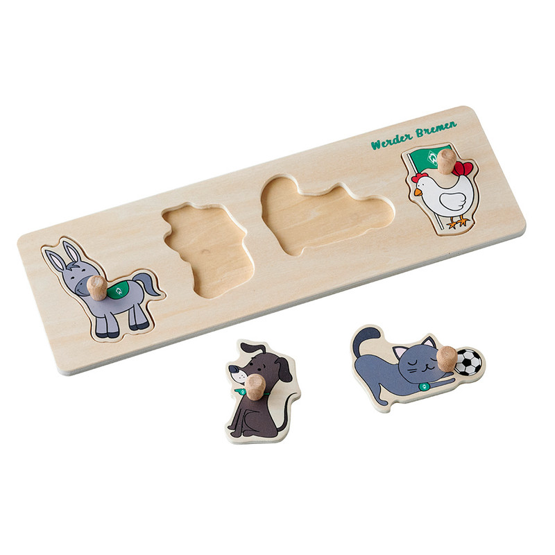Produktdetails Grün-weißer Spielspaß für die Kleinen. Das schöne SV Werder Bremen Holzpuzzle besteht aus 4 Teilen und die dürften den Werder-Kennern bekannt vorkommen: Die Bremer Stadtmusikanten.Das hölzerne Puzzle ist das perfekte Einstiegsspielzeug für die Kids. Damit wird spielerisch gelernt und zwar auch, dass der SV Werder und die Hansestadt Bremen einfach zusammengehören. Alle Mitglieder der Musikanten haben mindestens ein Fan-Utensil an sich, wie zum Beispiel der Esel einen Werder-Sattel oder der Hahn eine Werder-Fahne. Die Formen der Puzzleteile sind eindeutig, sodass die Kleinen spielerisch lernen, was es bedeutet zu puzzeln. Durch die Produktion aus Lindensperrholz hat das Spiel eine angenehme Haptik. Werder im Detail: auf den Fan-Artikeln der Bremer Stadtmusikanten findet sich jeweils eine Werder-Raute. Abgerundet wird das Puzzle durch den grünen „Werder Bremen“-Schriftzug auf der Vorderseite und somit vereinsverbundene Akzente setzt. #KinderzimmerDas Puzzle lässt keinen Zweifel daran, für welchen Verein dein Herz und das deines Nachwuchses schlägt: unseren SV Werder Bremen. So fällt es leicht seine Liebe zum Verein und der Hansestadt Bremen zu zeigen.Besonderheiten Holzpuzzle im Bremer Stadtmusikanten – Design Werder-Raute als kleine Details “Werder Bremen“-Schriftzug auf der Vorderseite Angaben zum Hersteller Werder Bremen Merchandising GmbH Hoerneckestraße 11/13 DE-28217 Bremenfanshop@werder.de