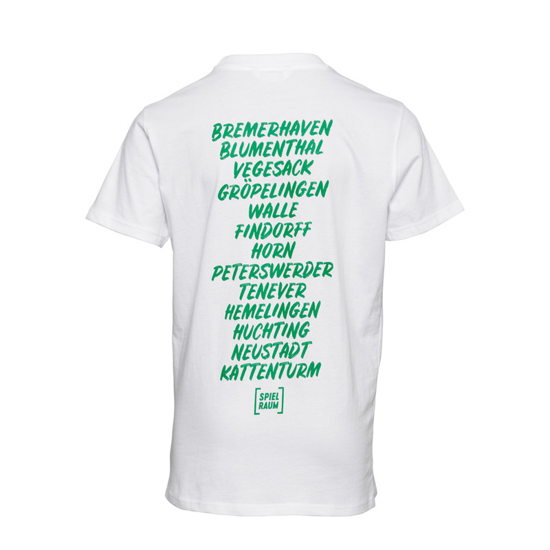 ProduktdetailsSPIELRAUM. Das aktuelle T-Shirt zum SPIELRAUM-Konzept des SV Werder Bremen lässt das Werder-Fan-Herz des Nachwuchs höher schlagen.SPIELRAUM-Konzept? Was ist das eigentlich? Das Wichtigste kurz zusammengefasst:Was ist das Ziel? Werder will möglichst vielen Kindern und Jugendlichen eine Sportbiografie ermöglichen, sie für den SVW und Sport begeistern und die Gesellschaft durch Sport positiv verändern. Ein Schlüssel dazu liegt im SPIELRAUM.Was ist ein SPIELRAUM? SPIELRAUM bezeichnet einen Sozialraum. Um Kinder zu erreichen, braucht es die räumliche Nähe. Gemeinsam mit Netzwerkpartnern arbeitet Werder hier daran, Kindern und Jugendlichen den Zugang zum Sport zu ermöglichen. In jedem SPIELRAUM bilden KiTas, Grund- und weiterführende Schulen sowie soziale Träger und Sportvereine ein Netzwerk. Werder hat in Bremen und Niedersachsen insgesamt zwanzig SPIELRÄUME definiert.Was passiert im SPIELRAUM? Hier haben Kinder und Jugendliche mit und ohne Beeinträchtigung und/oder Fluchterfahrung Zugang zum Sport, zum Beispiel durch wöchentliche Bewegungsangebote oder regelmäßige Events. 365 Tage im Jahr. Darüber hinaus bildet und qualifiziert Werder gemeinsam mit Netzwerkpartnern junge Menschen aus, um selbst Verantwortung zu übernehmen und neuen jungen Generationen das Sporttreiben zu ermöglichen. Involviert werden dabei auch Profi- und Nachwuchsspieler:innen des SVW.Das gemütliche Kinder Kurzarm-Shirt ist in Weiß gehalten und besticht durch Schlichtheit. Gleichermaßen wird damit der Fokus auf das Wichtige gelegt: Die Verbundenheit von Spielraum mit Werder und der Stadt Bremen. Das wird durch das SPIELRAUM-Logo, unsere Werder-Raute und die Designelemente wie der Umriss von Bremen sowie die Auflistung von Bremerhaven und der Bremer Stadtteile in Grün deutlich.Spread the word und unterstütze unser SPIELRAUM-Konzept. BesonderheitenHINWEISE ZUR NACHHALTIGKEIT:Dieses Produkt wurde zu 100% aus Baumwolle aus biologischem Anbau produziert. auf der linken (Herz-)Seite grüner Umriss von Bremen mit den jeweiligen Spielraum-Punktenebenfalls auf der Vorderseite unsere Werder-Rauteauf der Rückseite Auflistung: Bremerhaven und die Stadtteile von Bremensowie das „Spielraum“-LogoMehr Informationen unter https://www.werder.de/de/spielraum/startseite/10% vom VK gehen an die SV Werder Bremen Stiftung, die unser SPIELRAUM-Projekt unterstützt! FOTOSHOOTING IM SPIELRAUM TENENVERDie Fotos für die Artikel sind im SPIELRAUM Tenever entstanden. Vor der Kamera standen Kinder, die im Rahmen eines Jugendbeteiligungsprozesses am Bau eines neuen Bolzplatzes mitgewirkt haben. Dieser entstand in Zusammenarbeit mit Tim Borowski & Friends sowie Petri & Eichen, die als sozialer Träger vor allem im Bremer Osten aktiv sind und eng mit dem SVW kooperieren, um mehr Kinder in Bewegung zu bringen. Der SV Werder ergänzt dabei die bereits bestehende Jugendsozialarbeit durch Sport, indem Übungsleiter:innen die Sportangebote ergänzen und junge Menschen befähigen, selbst Verantwortung zu übernehmen.Angaben zum Herstellerhummel Sport & Leisure Warenhandelsgesellschaft mbH Leverkusenstrasse 54DE-22761 Hamburg info@hummelsport.de