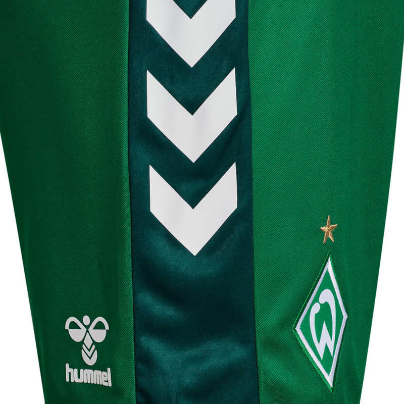 Produktdetails Die SV Werder Bremen Home-Sporthose 2025/26 ist in der Vereinsfarbe Grün gehalten und ist neben der weißen Sporthose ebenfalls eine perfekte Ergänzung zu dem Trikot Home.Auf der Vorderseite des rechten Hosenbeins veredeln die Werder-Raute als Web-Patch samt gesticktem Meisterstern und auf der Rückseite das weiße hummel-Logo das sportliche Design.An den Außenseiten der Hosenbeine sorgen die klassischen hummel-Winkel in Weiß auf dunkelgrünem Hintergrund für Farbakzente.        Der Gummizug und die Schnürung in der Bundinnenseite sorgen für einen perfekten Sitz. Dank des bequemen Schnitts lässt die Hose viel Bewegungsfreiheit zu.Passend zu dem Trikot Home 2025/26 macht diese Werder Heim-Sporthose dein Outfit komplett und zu einem perfekten Begleiter fürs Training, Fitnessstudio oder für den Bolzplatz.#TrikotHomeBesonderheiten SV Werder Bremen Home-Sporthose 2025/26 Grün kurze Sporthose bequemer Schnitt Werder Bremen Vereinslogo als Web-Patch auf dem rechten Hosenbein gestickter Meisterstern in Gold gummiertes hummel-Logo in Weiß auf der rechten Hosenbeinrückseite weiße hummel-Winkel an den Seiten farbliche Highlights in Dunkelgrün an den Seiten Gummizug und Schnürung in der Bundinnenseite enthält recyceltes Polyester Angaben zum Hersteller hummel Sport & Leisure Warenhandelsgesellschaft mbH Leverkusenstrasse 54 DE-22761 Hamburg info@hummelsport.de