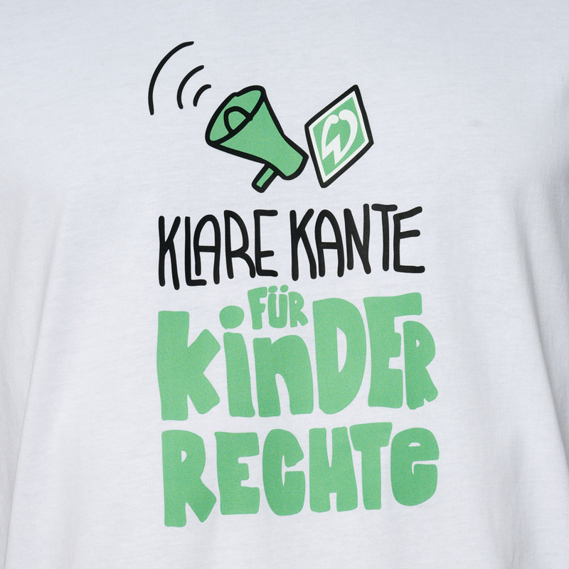 ProduktdetailsWerder x Weltkindertag!Mit diesem besonderen T-Shirt setzt du ein starkes Zeichen: Für Kinderrechte, für eine bessere Zukunft und für ein starkes Miteinander.Das weiße Shirt aus angenehm weicher Baumwolle zeigt auf der Vorderseite den ausdrucksstarken Print „Klare Kante für Kinderrechte“ – begleitet von einem Megafon und der Werder-Raute als Symbol für klare Haltung und soziale Verantwortung.Ob Groß oder Klein – das Shirt ist in Größen für Erwachsene und Kinder erhältlich und damit perfekt für alle, die sich gemeinsam mit Werder Bremen für den Schutz und die Rechte von Kindern stark machen wollen.Klare Kante zeigen – für Kinderrechte!Weitere Infos zum Kinderschutzkonzept „Sicherer Hafen“ des SV Werder Bremen gibt es hier.warmupBesonderheitenHINWEISE ZUR NACHHALTIGKEIT:Dieses Produkt wurde zu 100% aus Baumwolle aus biologischem Anbau produziert. weißes T-Shirt mit Frontprint „Klare Kante für Kinderrechte“Design mit unserer Werder-Raute und Megafonin Erwachsenen- und Kindergrößen erhältlichRegular Fitoffizielles Statement-Piece zum Weltkindertag Pro verkauftem Kindershirt fließen 4 €, pro Erwachsenenshirt 7 € in die Werder Stiftung, die Projekte in Bremen zur Stärkung von Kindern und Jugendlichen unterstützt. Angaben zum Herstellerhummel Sport & Leisure Warenhandelsgesellschaft mbH Leverkusenstrasse 54DE-22761 Hamburg info@hummelsport.de