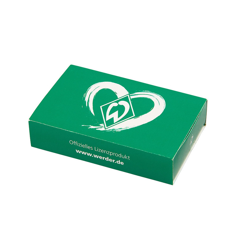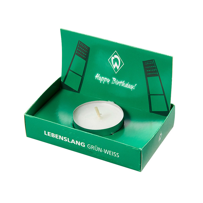 Produktdetails Grün-weiße Geburtstagsgrüße. Mit dieser SV Werder Bremen Teelicht Grußkarte kannst du einem Werder Fan perfekt zum Geburtstag gratulieren.Zeit zu feiern! Optisches Highlight der Grußkarte ist das Kärtchen zum Aufstellen. Der Schriftzug „Happy Birthday“ ist zwischen zwei Flutlichtmasten des WESERSTADIONs gedruckt. Da kommt sofort Stadion-Feeling auf. Natürlich darf die Werder-Raute nicht fehlen, sie ist mittig über dem Schriftzug gedruckt und sorgt für vereinsverbundene Akzente. Der Vereinsclaim „Lebenslang grün-weiß“ auf der Vorderseite des Teelichthalters komplettiert das fußballstarke Design. Abgerundet wird die Aufmachung durch die Werder-Raute auf der linken und rechten Seite des Teelichthalters. Verpackt ist die Grußkarte in einer Banderole passend zum Design der Grußkarte. Die Vorderseite der Banderole ziert ein weißes Herz und die Werder-Raute und macht die Grußkarte zu einer runden Sache.Eine schöne Art, jedem zum Geburtstag zu gratulieren. Diese Grußkarte lässt das Herz eines jeden Werder-Fans höherschlagen.Besonderheiten Grußkärtchen in grün-weiß „Happy Birthday“-Schriftzug Werder-Raute oberhalb des Schriftzugs Flutlichtmasten des WERSERSTADIONs Teelichthalter in grün-weiß Vereinsclaim „Lebenslang grün-weiß“ auf der Vorderseite Werder-Raute links und rechts Bandarole in grün-weiß Herz mit Werder-Raute Angaben zum Hersteller Werder Bremen Merchandising GmbH Hoerneckestraße 11/13 DE-28217 Bremenfanshop@werder.de