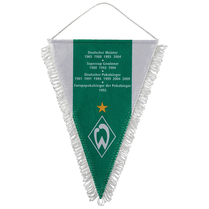 Produktdetails Die grün-weißen Erfolge immer im Blick. Mit dem Werder Bremen Wimpel. Alle Erfolge des SVW sind hier verzeichnet.Besonderheiten weißes Band zum Aufhängen Werder-Raute mit Stern beidseitig Auflistung der Titel auf einer Seite Angaben zum Hersteller Werder Bremen Merchandising GmbH Hoerneckestraße 11/13 DE-28217 Bremenfanshop@werder.de